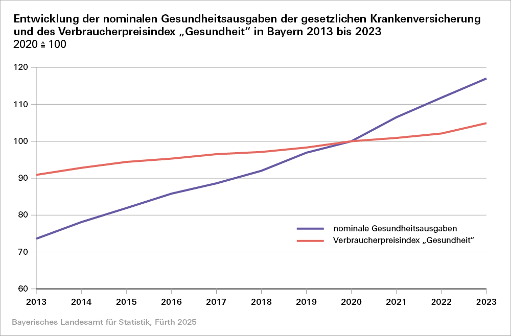 Die Entwicklung der nominalen Gesundheitsausgaben ist immer im Verhältnis zur Preissteigerung zu betrachten. So steht dem nominalen Anstieg der ärztlichen Leistungen um rund 11 Prozent seit 2020 eine Erhöhung des Verbraucherpreisindex für Gesundheit um 4,9 Prozent im selben Zeitraum gegenüber. Auch wenn der Ausgabenanstieg somit zu einem Teil auf höhere Preise zurückzuführen ist, bleibt unter dem Strich auch real ein erheblicher Ausgabenzuwachs zu verzeichnen..