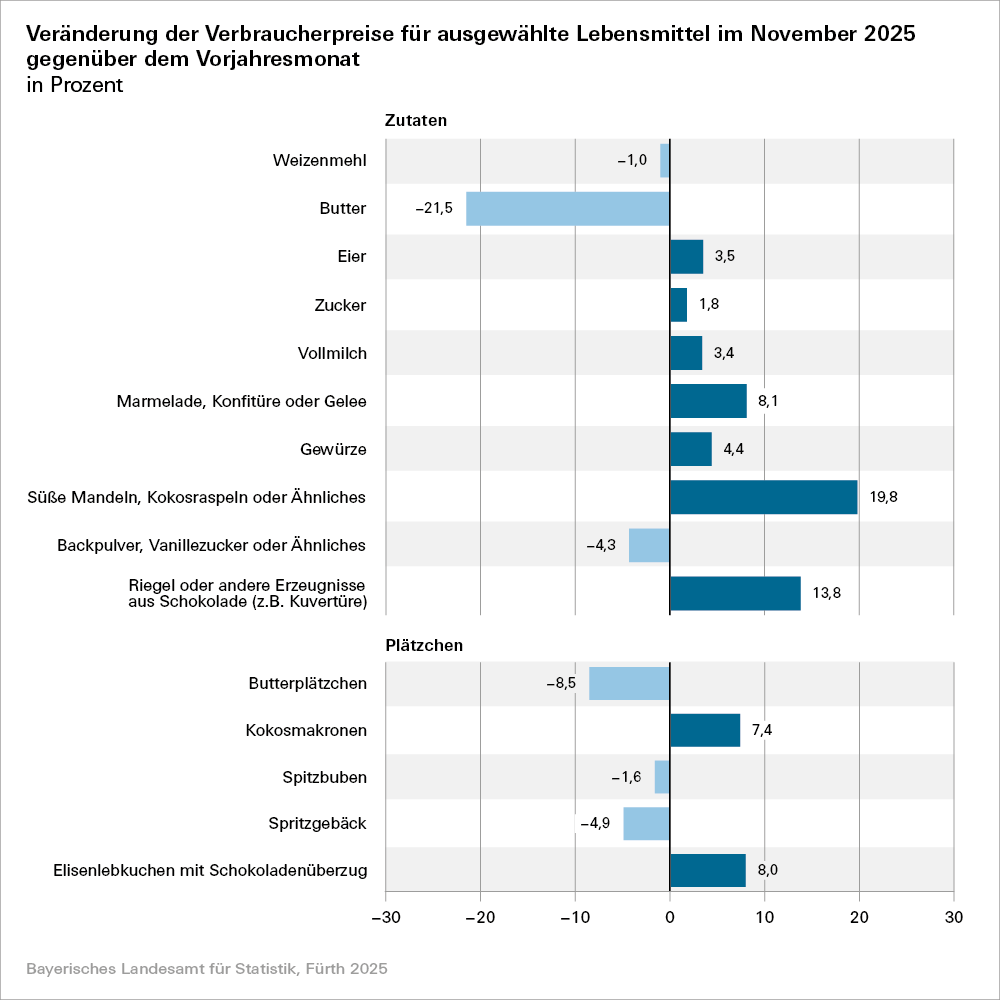 Fürth. Nach einer Analyse des Bayerischen Landesamts für Statistik wirkt sich die Inflation in Bayern in der Vorweihnachtszeit 2025 unterschiedlich auf das Plätzchenbacken aus. So kostet Butter im November 2025 deutlich weniger als noch im Vorjahresmonat (-21,5 Prozent). „Andere Schokoladenerzeugnisse“ wie z.B. Kuvertüre (+13,8 Prozent) sowie süße Mandeln, Kokosraspeln oder Ähnliches (+19,8 Prozent) sind hingegen deutlich teurer geworden.