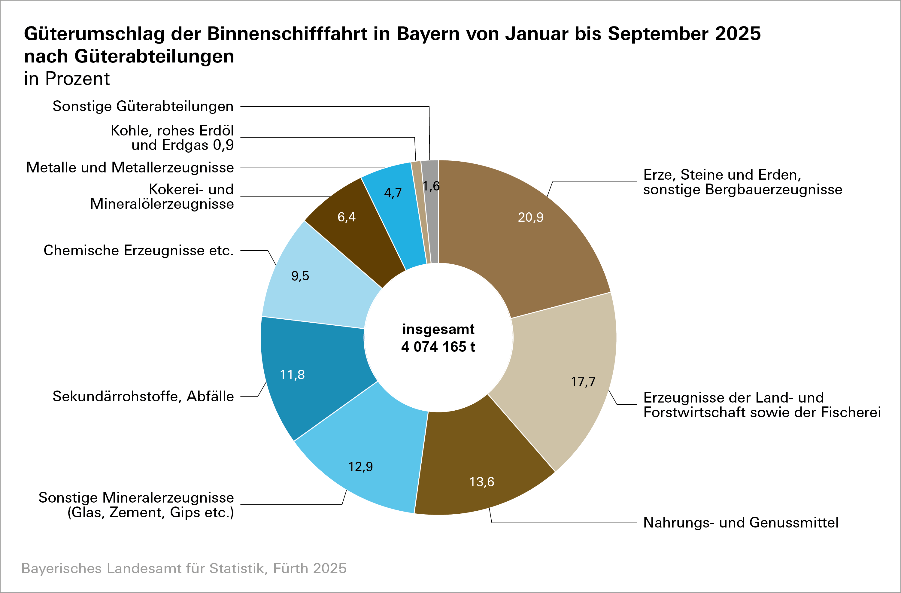 In den Häfen der bayerischen Bundeswasserstraßen werden in den ersten drei Quartalen 2025 hauptsächlich „Erze, Steine und Erden“ (20,9 Prozent) umgeschlagen. „Erzeugnisse der Land- und Forstwirtschaft“ (17,7 Prozent) sind der zweitgrößte Posten. „Nahrungs- und Genussmittel“ machen 13,6 Prozent aus, und 12,9 Prozent der umgeschlagenen Güter entfallen auf „sonstige Mineralerzeugnisse“ (Glas, Zement, Gips etc.).