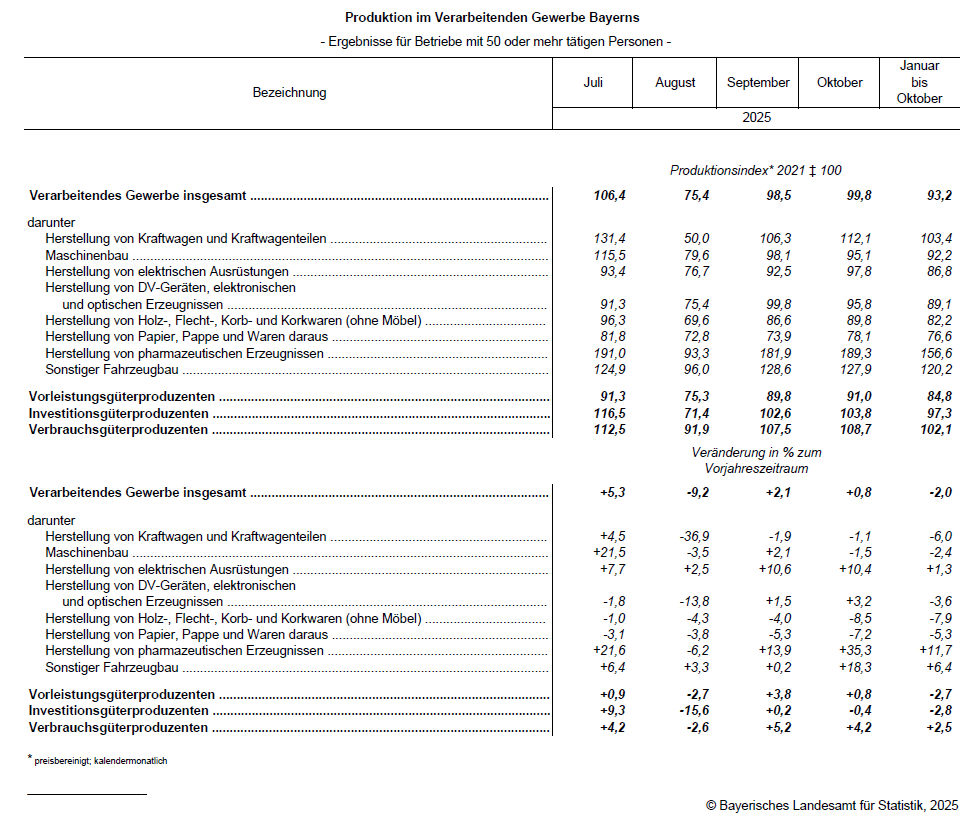 Nach Angaben des Bayerischen Landesamts für Statistik fällt die Produktion des Verarbeitenden Gewerbes in Bayern im Oktober 2025 mit einem leichten Plus von 0,8 Prozent etwas höher aus als im Vorjahresmonat. Die ersten zehn Monate des Jahres 2025 ergeben hingegen ein Minus von 2,0 Prozent.