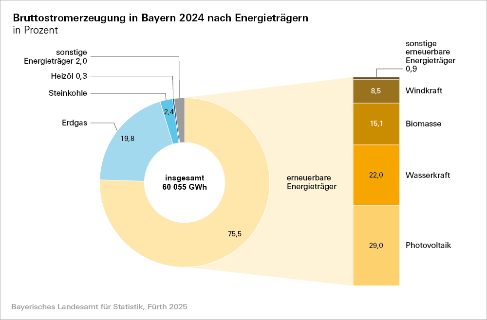 Das Bayerische Landesamt für Statistik teilt mit, dass sich die Bruttostromerzeugung im Jahr 2024 mit 60 055 GWh im Vergleich zum Vorjahr insgesamt - trotz Wegfall der Stromerzeugung aus Kernenergie, die zuletzt noch 3 024 GWh betrug - kaum verändert hat. Die Bruttostromerzeugung aus erneuerbaren Energien hingegen steigt auf 45 327 GWh (+6,1 Prozent), davon 17 389 GWh (+7,8 Prozent) aus Photovoltaik. Die erneuerbaren Energien erreichen damit absolut und relativ mit einem Anteil von 75,5 Prozent der bayerischen Bruttostromerzeugung einen neuen Höchstwert. Die Bruttostromerzeugung aus fossilen Energieträgern zeigt sich mit einer Verschiebung zur Stromerzeugung aus Erdgas insgesamt unverändert.