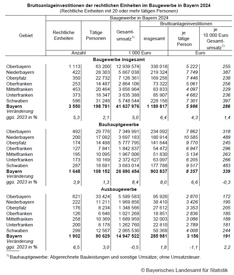 Über sechs Prozent Plus bei Investitionen im bayerischen Baugewerbe für das Geschäftsjahr 2024
