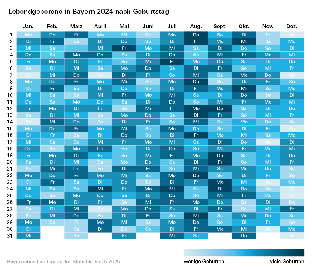 Dezember 2024 in Bayern 8 760 Lebendgeborene verzeichnet, im Durchschnitt also 283 Kinder pro Tag. Der Dezember gilt als ein Monat mit vergleichsweise niedrigen Geburtenzahlen, während die Sommermonate regelmäßig zu den geburtenstärksten Monaten zählen. Die meisten Lebendgeburten des Jahres 2024 wurden im Juli mit insgesamt 10 472 neuen Erdenbürgern verzeichnet, das entsprach 338 Geburten pro Tag. Der geburtenstärkste Tag war im Jahr 2024 der 16. August, an dem 401 Kinder das Licht der Welt erblickten.
