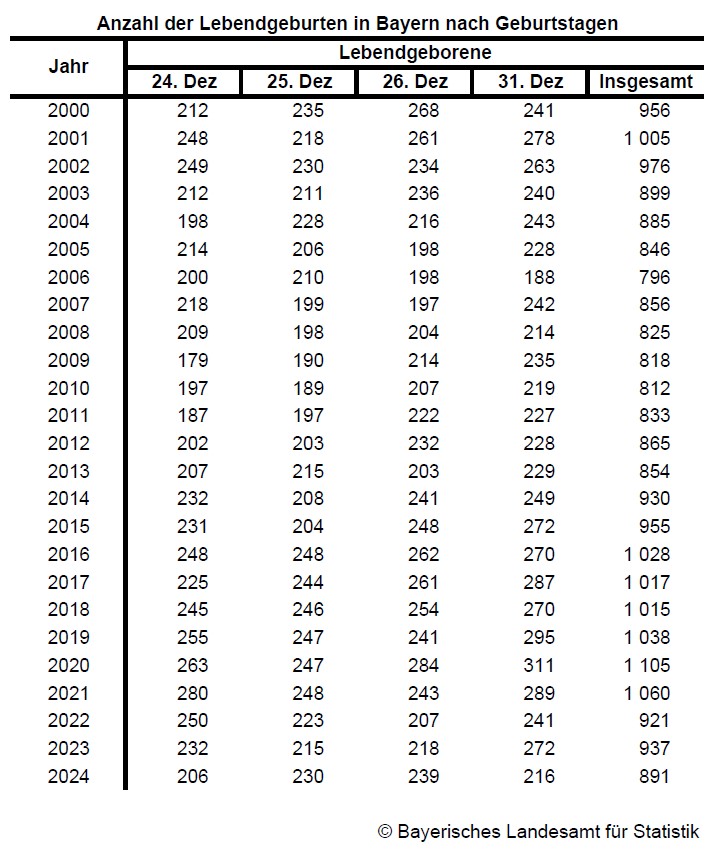 24. Dezember 2024 in Bayern insgesamt 206 Kinder lebend zur Welt. An den beiden Weihnachtsfeiertagen 2024 wurden zusammen weitere 469 Kinder und am Silvestertag