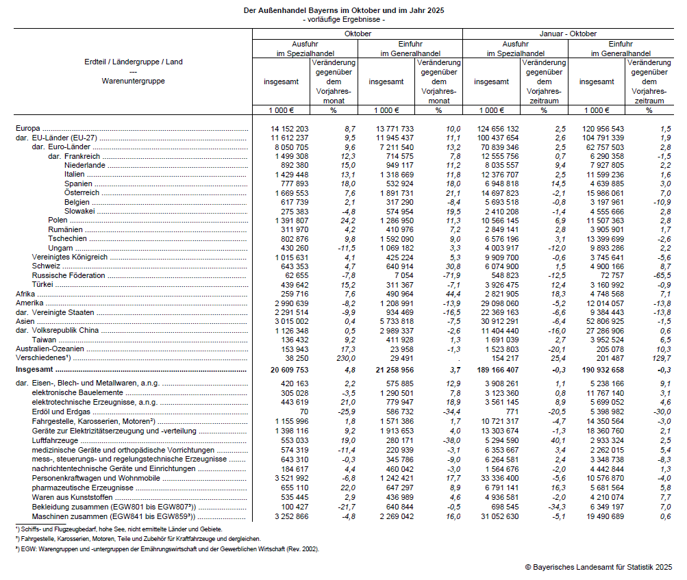 Tabelle zum Außenhandel Bayerns im Oktober 2025