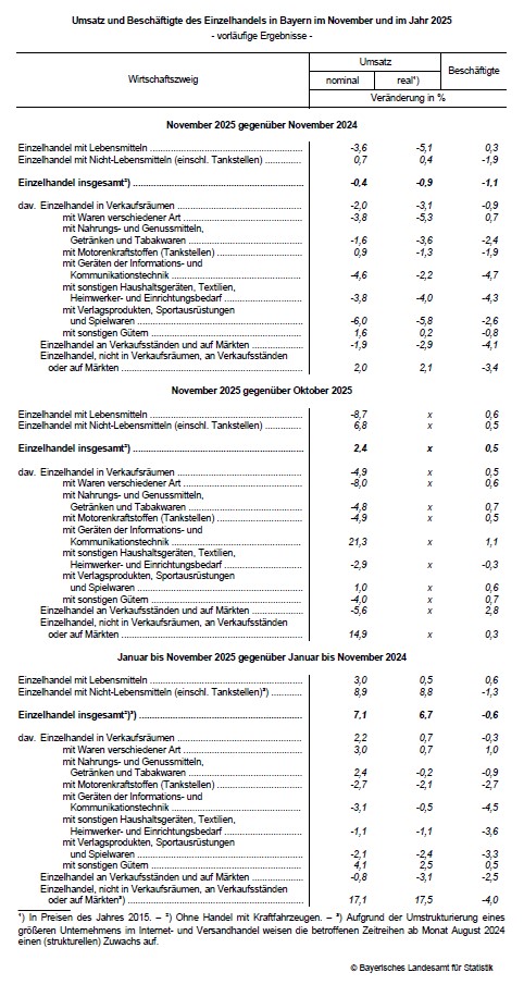 Wie das Bayerische Landesamt für Statistik nach den vorläufigen Ergebnissen der „Monatsstatistik im Einzelhandel“ berichtet, sinkt der Umsatz im bayerischen Einzelhandel (ohne Kraftfahrzeughandel) im November 2025 im Vergleich zum November 2024 nominal um 0,4 Prozent und real um 0,9 Prozent. Die Zahl der Beschäftigten geht um 1,1 Prozent zurück.