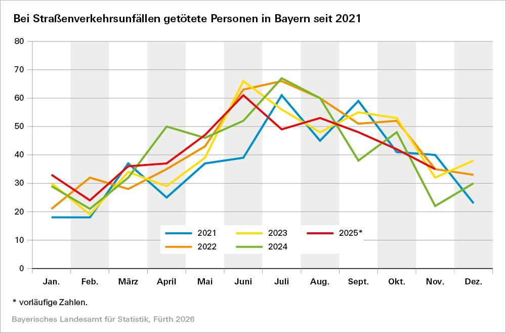 30 940 Straßenverkehrsunfälle in Bayern registriert. Das entspricht einem leichten Rückgang um 2,7 Prozent gegenüber dem Vorjahresmonat. Laut Mitteilung des Bayerischen Landesamts für Statistik verunglückten dabei insgesamt 3 702 Personen (-12,7 Prozent). Davon wurden 3 667 Verkehrsteilnehmer verletzt (-13,1 Prozent), 35 Personen wurden bei einem Verkehrsunfall getötet (November 2024: 22).