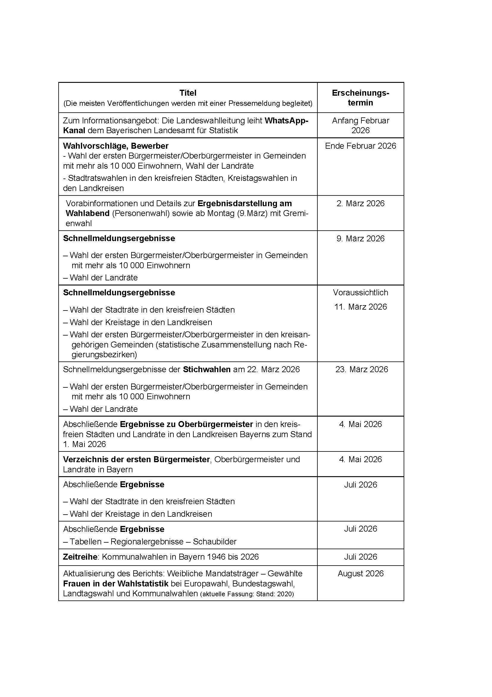Veröffentlichungsplan des Bayerischen Landesamts für Statistik zu den Kommunalwahlen am 8. März 2026