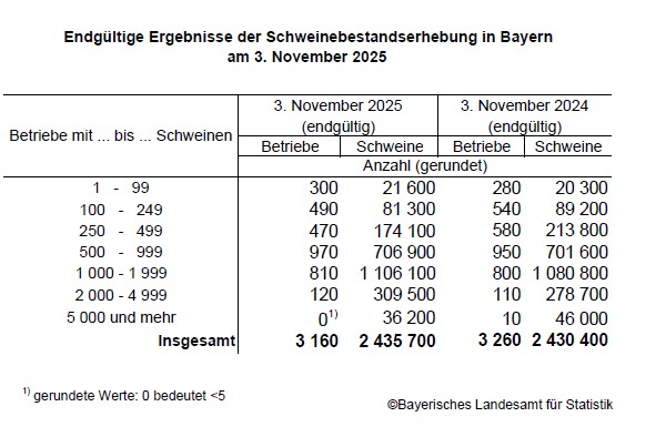 Fürth. Wie das Bayerische Landesamt für Statistik nach den endgültigen Ergebnissen der Schweinebestandserhebung zum Stichtag 3. November 2025 mitteilt, ist die Zahl der Schweine gegenüber dem Vorjahr um 0,2 Prozent (5 300 Tiere) auf 2 435 700 Tiere gestiegen. Die Anzahl der schweinehaltenden Betriebe liegt bei rund 3 160, das sind 3,1 Prozent weniger als ein Jahr zuvor: Zum 3. November 2024 waren noch rund 3 260 Betriebe in Bayern aktiv. Im Durchschnitt hält jeder Betrieb 771 Tiere, etwa 26 mehr als im November 2024.