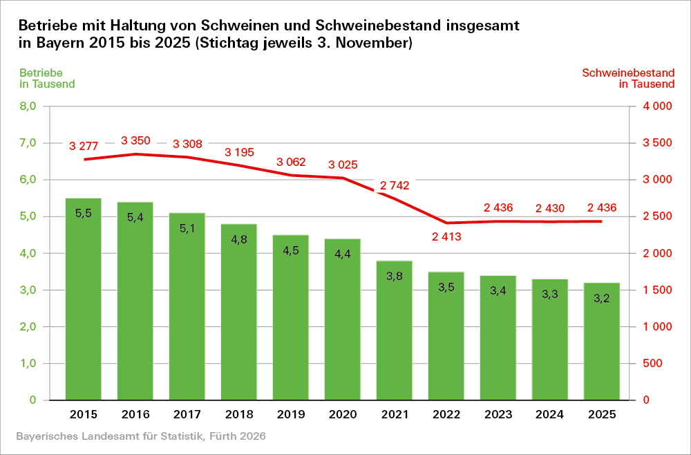 3. November 2025 werden in Bayern insgesamt 2 435 700 Schweine gehalten. Damit steigt der Schweinebestand im Vergleich zur Vorjahreserhebung leicht um 0,2 Prozent. Gleichzeitig werden mit rund 3 160 etwa 100 schweinehaltende Betriebe weniger als im Vorjahr gezählt. Auf jeden Betrieb entfallen im November 2025 durchschnittlich 771 Schweine und damit 26 mehr als im Jahr zuvor.