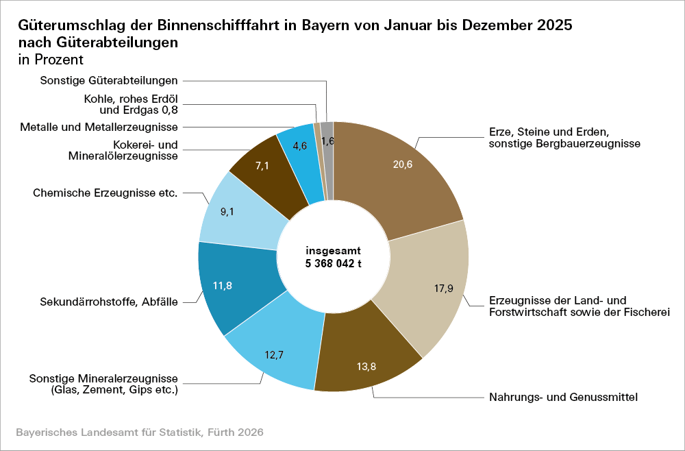 Zu Wasser werden von den knapp 5,4 Millionen Tonnen Güterumschlag im Jahr 2025 in Bayern hauptsächlich „Erze, Steine und Erden“ (20,6 Prozent), „Erzeugnisse der Land- und Forstwirtschaft“ (17,9 Prozent), „Nahrungs- und Genussmittel“ (13,8 Prozent) sowie „sonstige Mineralerzeugnisse“ (12,7 Prozent) transportiert.