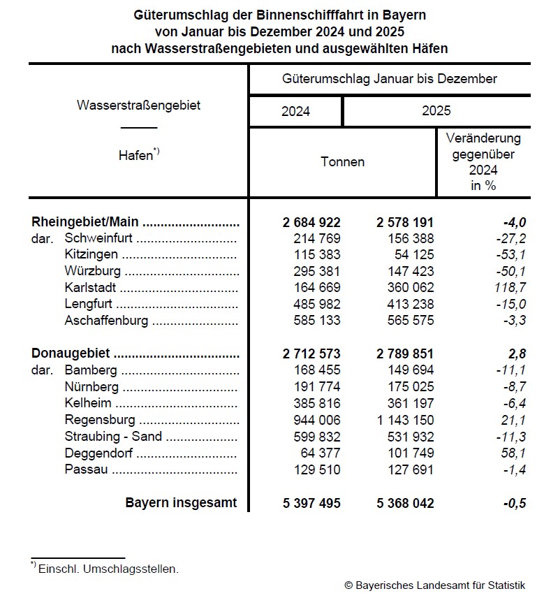 Im Jahr 2025 erzielen die bayerischen Binnenhäfen knapp 5,4 Millionen Tonnen Güterumschlag. Wie das Bayerische Landesamt für Statistik mitteilt, werden gegenüber dem Jahr 2024 um 0,5 Prozent weniger Güter auf dem Wasser transportiert. Hiervon entfallen auf das Maingebiet knapp 2,6 Millionen Tonnen, das sind 4,0 Prozent weniger Güterumschlag als im Vorjahr. Das Donaugebiet erreicht ein leichtes Plus von 2,8 Prozent auf rund 2,8 Millionen Tonnen Güter. Die umschlagstärksten Häfen an der Donau sind Regensburg und Straubing-Sand, am Main sind dies Aschaffenburg und Lengfurt.