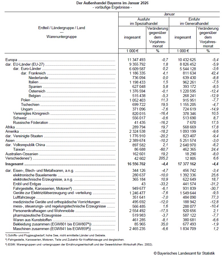 Die Ausfuhren der bedeutendsten Exportgüter der bayerischen Wirtschaft „Personenkraftwagen und Wohnmobile“ (-17,5 Prozent), „Maschinen“ (-6,6 Prozent), „Geräte zur Elektrizitätserzeugung und –verteilung“ (-7,6 Prozent) und „Fahrgestelle, Karosserien, Motoren, Teile und Zubehör für Kraftfahrzeuge und dergleichen“ (-6,1 Prozent) gehen ebenfalls zurück. Der Exportwert von „Personenkraftwagen und Wohnmobile“ liegt im Januar 2026 bei knapp 2,6 Milliarden Euro, der Exportwert von „Maschinen“ bei knapp 2,5 Milliarden Euro und der Exportwert von „Geräte zur Elektrizitätserzeugung und –verteilung“ bei gut 1,2 Milliarden Euro. Der Exportwert von „Fahrgestelle, Karosserien, Motoren, Teile und Zubehör für Kraftfahrzeuge und dergleichen“ erreicht noch gut 0,9 Milliarden Euro.