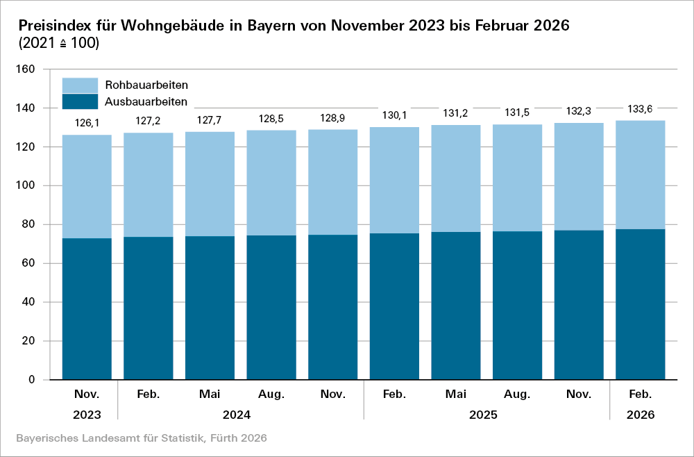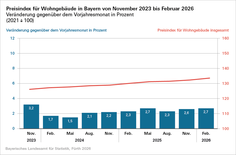 Im Jahresvergleich sind im Februar 2026 die Preise für den Neubau von Wohngebäuden in Bayern um durchschnittlich 2,7 Prozent gestiegen. Im November 2025 lag die Preissteigerungsrate binnen Jahresfrist auf einem ähnlichen Niveau (+2,6 Prozent). Seit 2021 sind die Preise für den Neubau für Wohnungen in Bayern damit um 33,6 Prozent gestiegen.