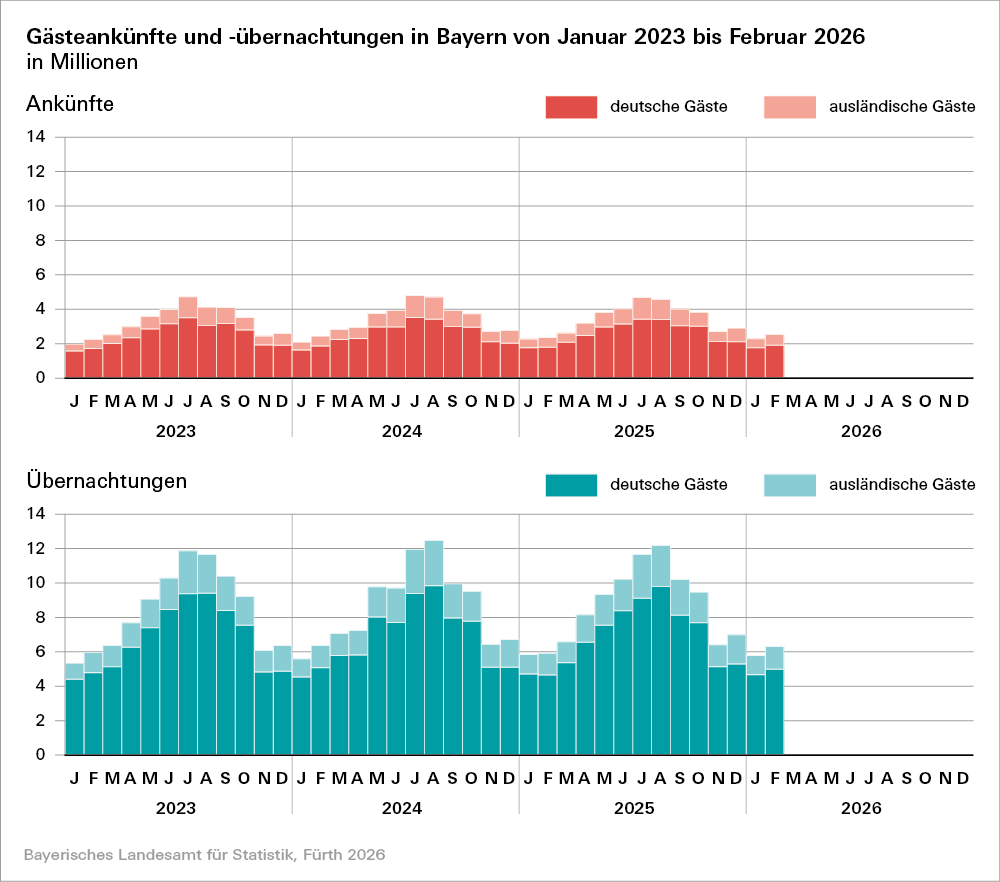 Mehr Ergebnisse enthält der Statistische Bericht, der (voraussichtlich) in KW 15/2026 erscheint: „Tourismus in Bayern im Februar 2026 (Bestellnummer: G4100C 202602)