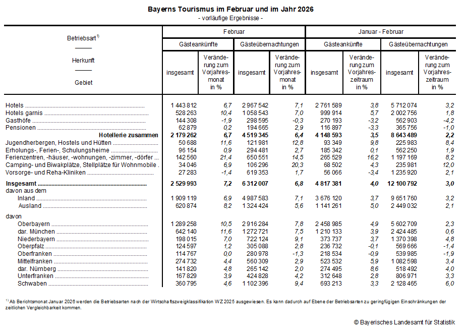 Wie das bayerische Landesamt für Statistik nach den vorläufigen Ergebnissen der Monatserhebung im Tourismus mitteilt, steigt in den bayerischen Beherbergungsbetrieben die Anzahl der Gästeankünfte im Februar 2026 um 7,2 Prozent im Vergleich zum Vorjahresmonat auf gut 2,5 Millionen. Die Übernachtungszahlen erhöhen sich um 6,8 Prozent auf über 6,3 Millionen.