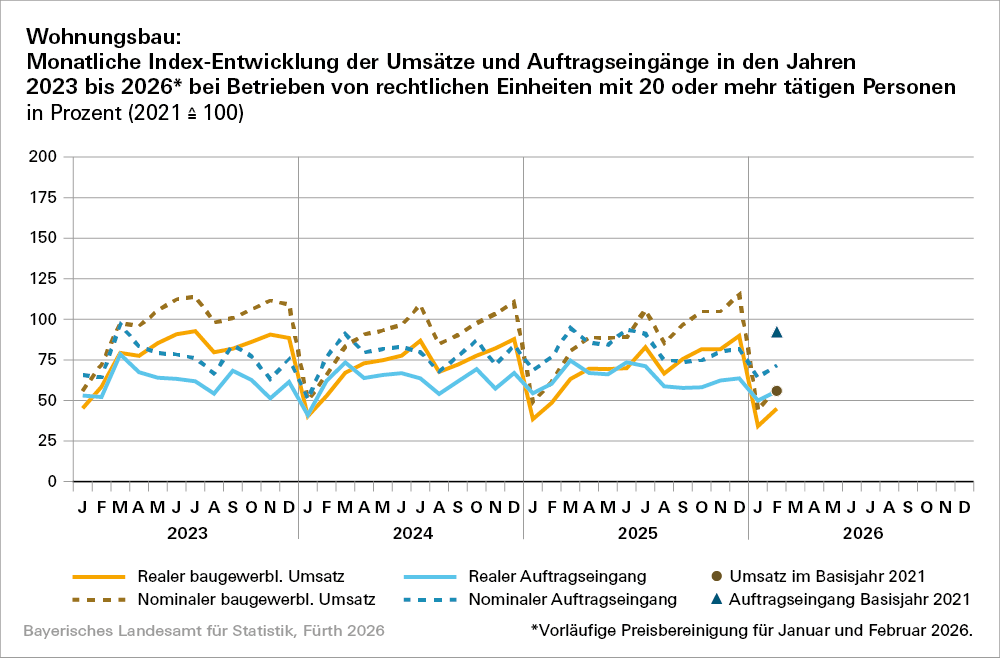 Im Vergleich zum Februar 2025 sinken sowohl nominaler und realer baugewerblicher Umsatz (‑15,6 Prozentpunkte bzw. ‑12,5 Prozentpunkte). Der Auftragseingang ist mit nominal ‑5,9 Prozentpunkten und real ‑5,2 Prozentpunkten ebenfalls rückläufig.
