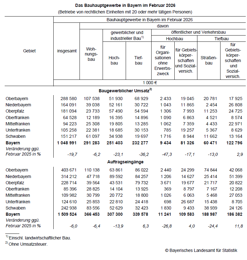 Im Februar 2026 erzielt das bayerische Bauhauptgewerbe einen baugewerblichen Umsatz von rund 1,05 Milliarden Euro. Gegenüber Februar 2025 bedeutet das einen Rückgang um etwa ein Fünftel. Die schwache Umsatzentwicklung der Branche zum Jahresstart betrifft sowohl den Hoch- als auch den Tiefbau.
