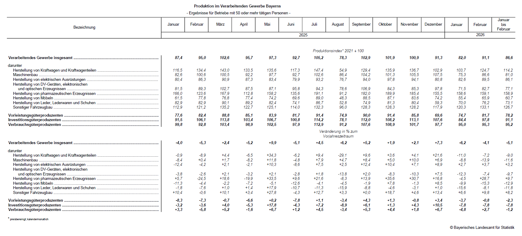Nach Angaben des Bayerischen Landesamts für Statistik verzeichnet die Produktion des Verarbeitenden Gewerbes in Bayern im Februar 2026 einen Rückgang von 4,1 Prozent gegenüber dem Vorjahresmonat. Die ersten beiden Monate des Jahres 2026 ergeben ein Minus von 5,1 Prozent. Vor allem die Produzenten von Investitionsgütern reduzieren ihr Produktionsvolumen in diesem Zeitraum deutlich.