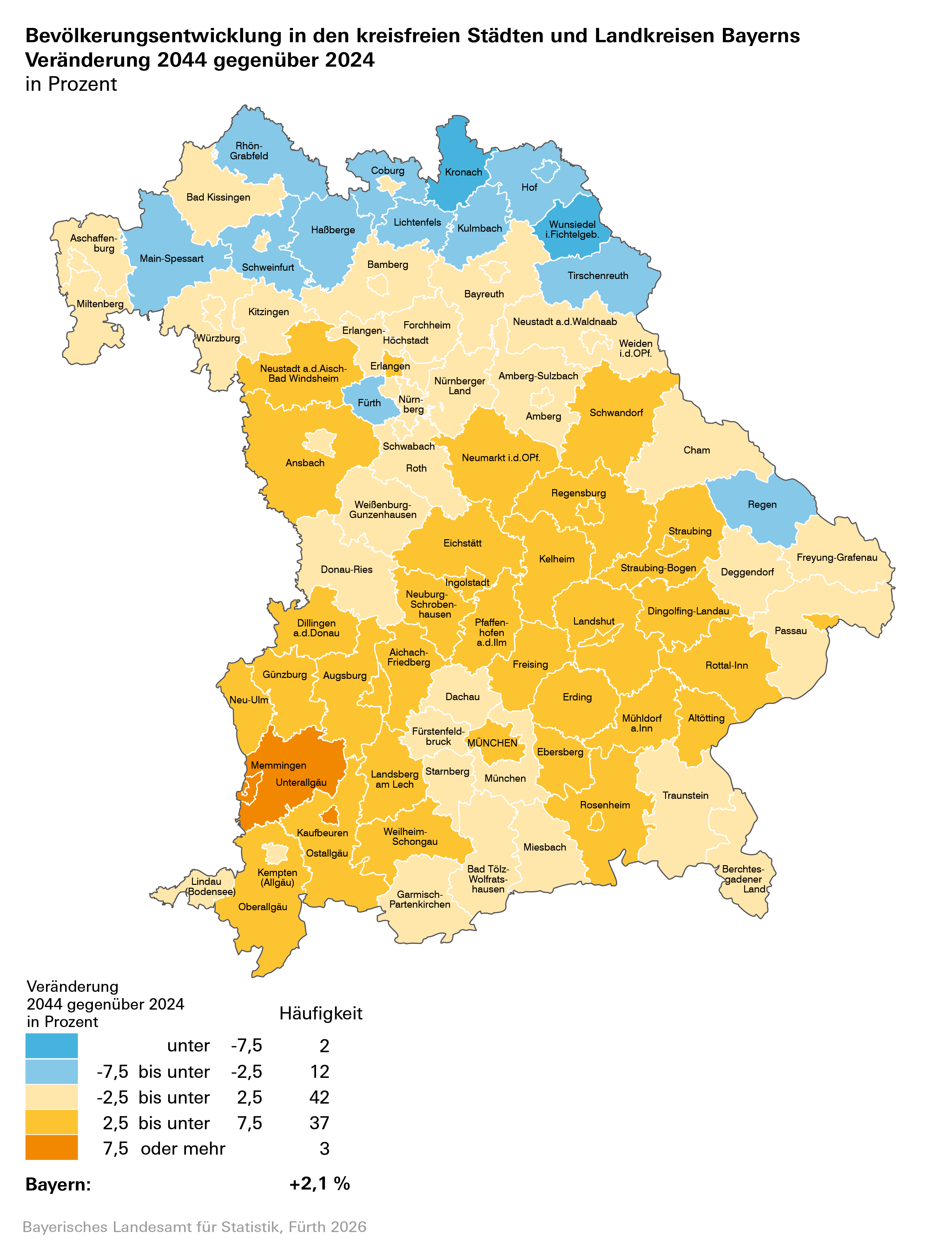 785 (38,2 Prozent) von einem deutlichen Bevölkerungswachstum ausgehen, 802 (39,0 Prozent) der bayerischen Gemeinden werden mit Veränderungen zwischen -2,5 Prozent bis unter +2,5 Prozent eine relativ stabile Bevölkerungsentwicklung aufweisen. Für 469 Gemeinden (22,8 Prozent) werden bis zum Jahr 2038 deutlichere Bevölkerungsrückgänge erwartet.