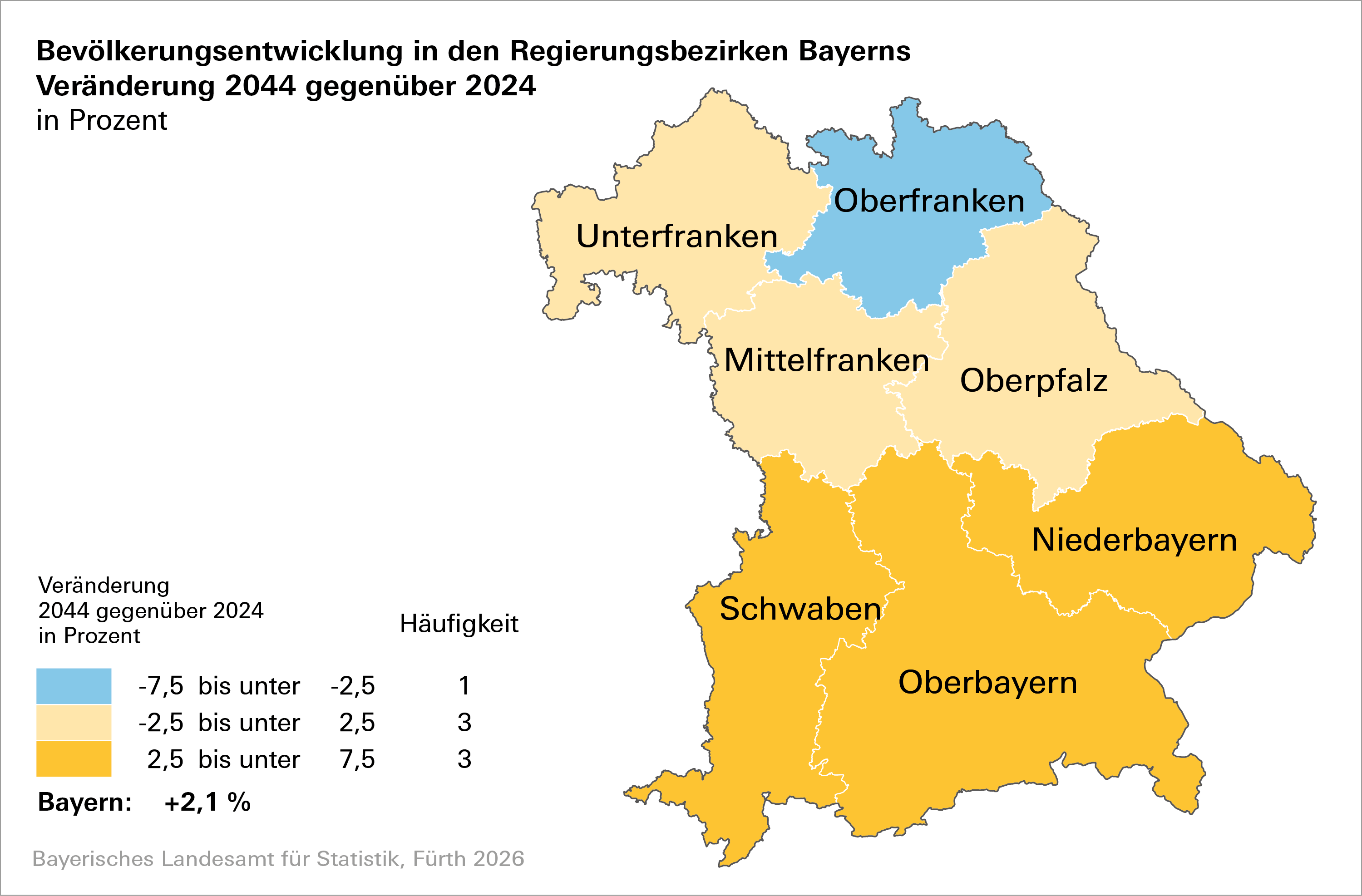 Wenngleich auch in Zukunft allen kreisfreien Städten und Landkreisen Wanderungsgewinne vorausberechnet werden, verläuft die demographische Entwicklung regional unterschiedlich. Drei der sieben Regierungsbezirke Bayerns weisen mit Blick auf die Bevölkerungszahl ein deutliches Plus zwischen drei bis etwa fünf Prozent auf.