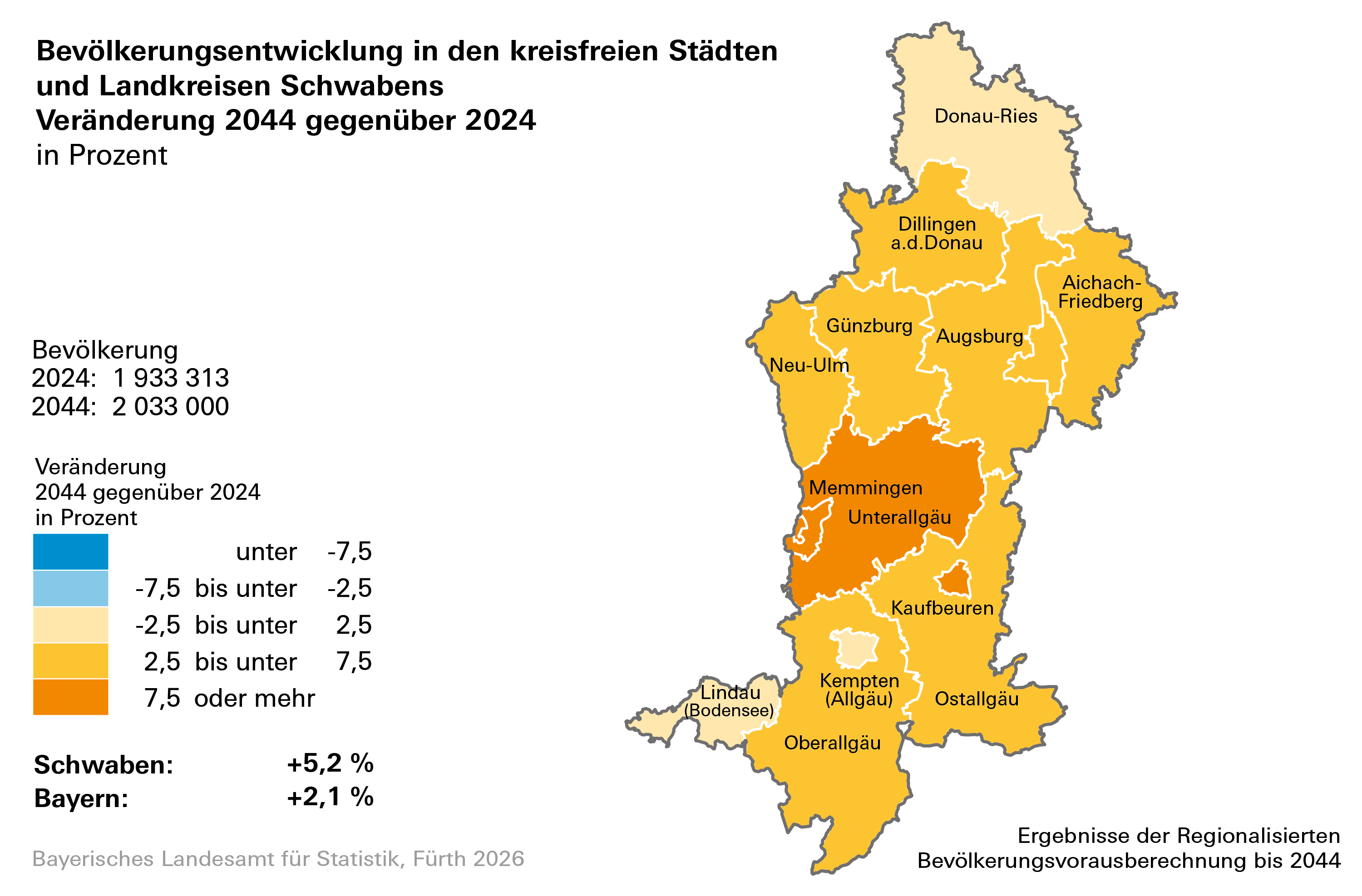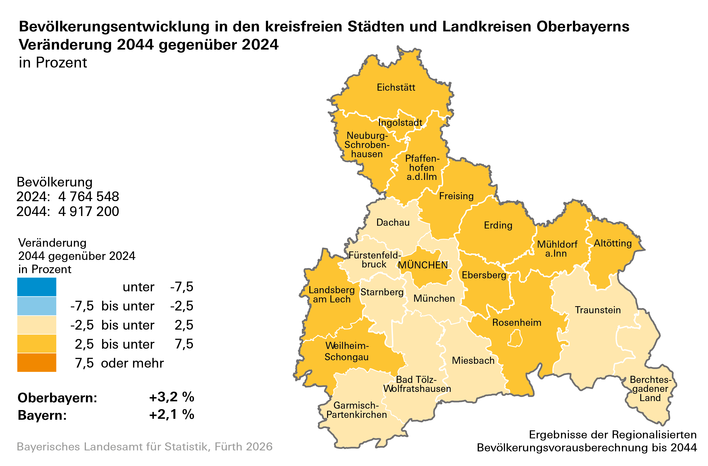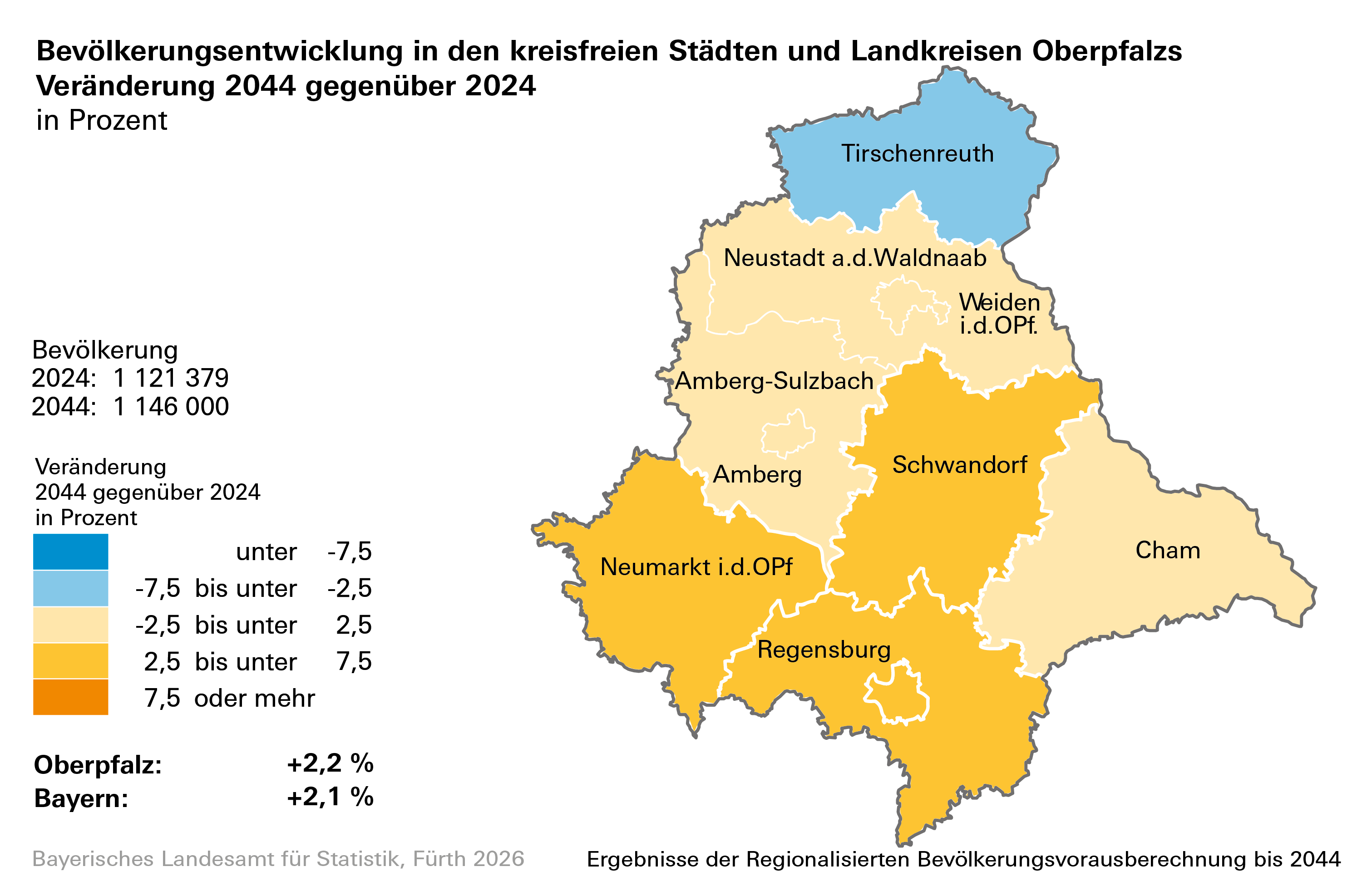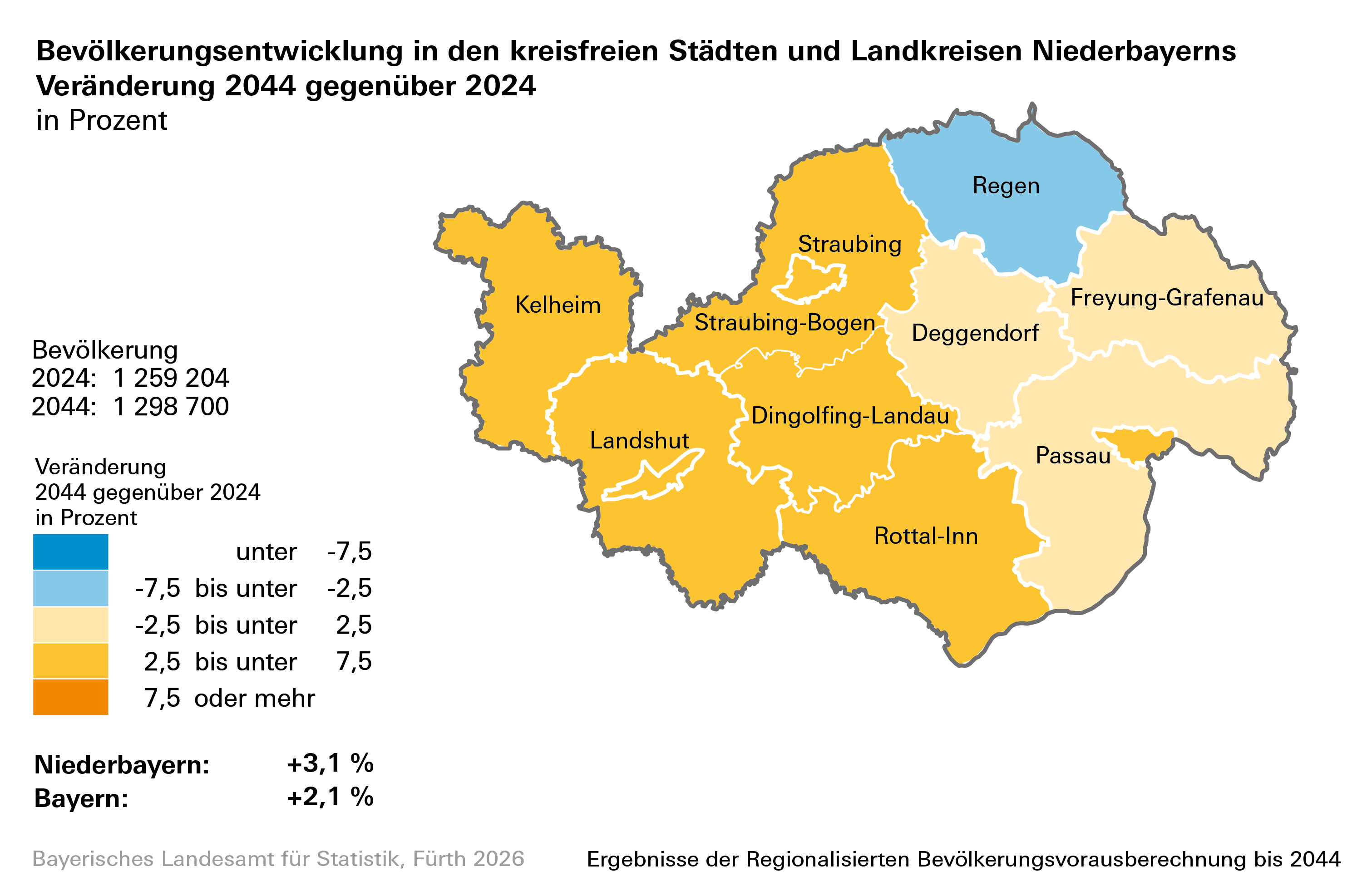 • Bevölkerung Bayerns wächst in der Vorausberechnung weiterhin moderat.  Es ergibt sich ein Zuwachs von rund 278 000 Einwohnern bis zum Jahr 2044. Die Gesamteinwohnerzahl Bayerns läge dann bei etwa 13,53 Millionen.