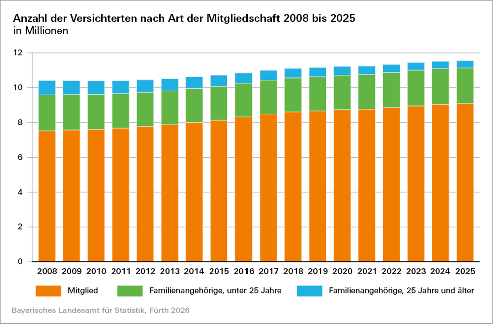 Mit 87 Prozent ist der überwiegende Anteil der bayerischen Bevölkerung Mitglied in der GKV. Nach aktuellen Zahlen der gesetzlichen Krankenkassen sind von den GKV-Mitgliedern im Jahr 2025 insgesamt 21,4 Prozent beitragsfrei als Familienangehörige mitversichert. Diese Gruppe umfasst insbesondere Kinder sowie Ehegatten. Kinder können bis zum Alter von 25 Jahren beitragsfrei mitversichert sein. Die aktuellen Reformüberlegungen betreffen die Gruppe der mitversicherten Ehegatten, wenn sie nicht Kinder unter 7 Jahren, Kinder mit Behinderung oder pflegebedürftige Angehörige betreuen und auch nicht bereits Rente beziehen. Da aus den Daten der gesetzlichen Krankenkassen nur das Alter der beitragsfrei Mitversicherten hervorgeht, kann der Kreis der ggf. betroffenen Ehegatten nur geschätzt werden. Betrachtet man deswegen ausschließlich die mitversicherten Personen im Alter von 25 Jahren und älter, zeigt sich, dass deren Anteil an allen GKV-Versicherten in Bayern kontinuierlich rückläufig ist und von 8,0 Prozent im Jahr 2008 auf