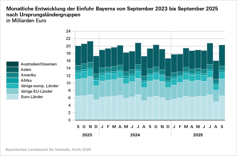 Monatliche Entwicklung der Einfuhr Bayerns nach Ursprungsländergruppen